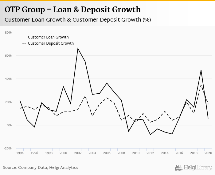 OTP Group's customer loan growth reached 5.04% in 2020, down from 47.3% compared to the previous year. Historically, the bank’s loans growth reached an all time high of 66.0% in 2002 and an all time low of -8.27% in 2012. In the last decade, the average annual loan growth amounted to 6.35%.