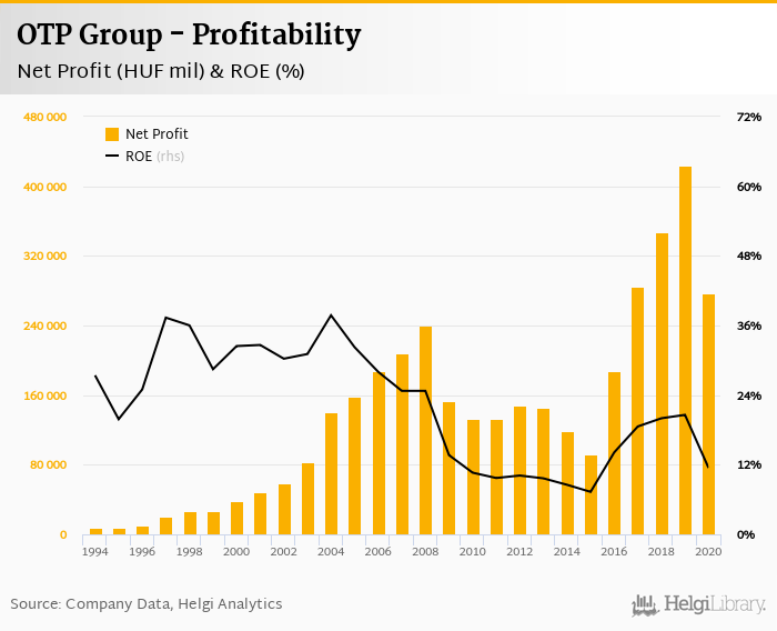 OTP Group made a net profit of HUF 276,408 mil in 2020, down 34.8% compared to the previous year. This implies a return on equity of 11.4%.