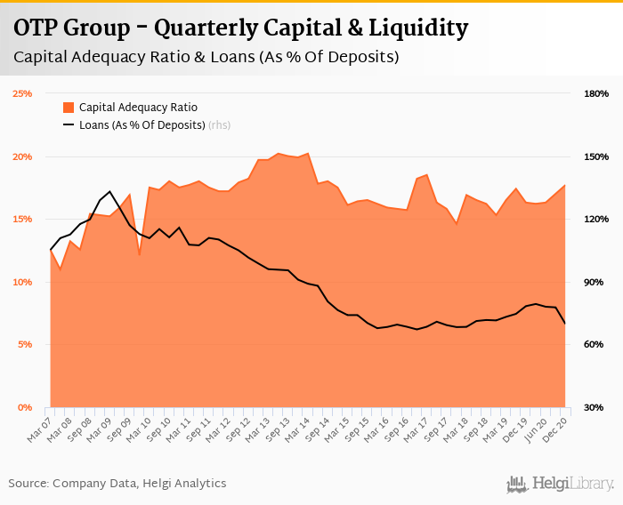 OTP Group's capital adequacy ratio reached 17.7% at the end of fourth quarter of 2020, up from 17.0% when compared to the previous quarter. Historically, the bank’s capital ratio hit an all time high of 20.2% in 1Q2014 and an all time low of 11.0% in 4Q2007.