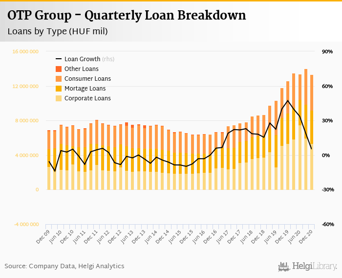 OTP Group's loans reached HUF 13,312,100 mil in the fourth quarter of 2020, down from HUF 13,993,500 mil when compared to the previous quarter and up from HUF 12,573,600 mil when compared to the same period of last year. Historically, the bank’s loans reached an all time high of HUF 13,993,500 mil in 3Q2020 and an all time low of HUF 6,423,590 mil in 4Q2015.