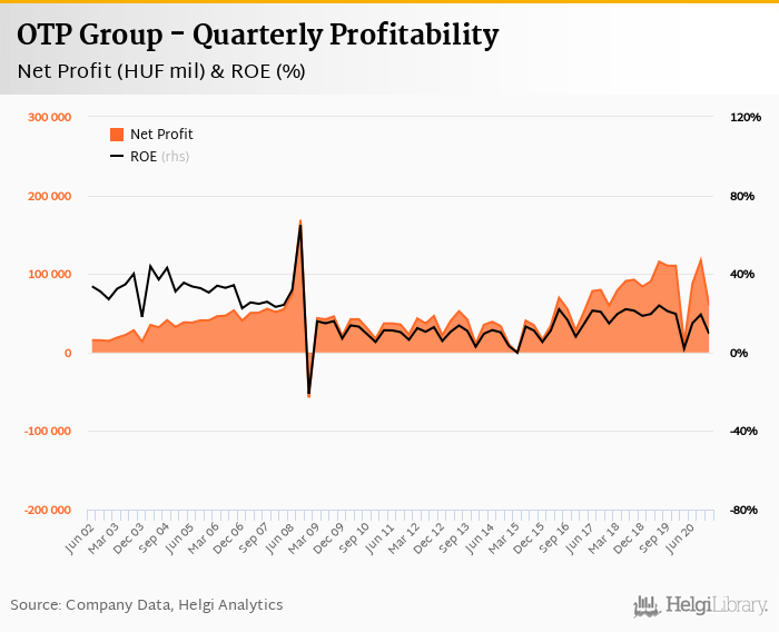 OTP Group made a net profit of HUF 59,732 mil in the fourth quarter of 2020, down 45.9% when compared to the same period of last year. This implies a return on equity of 9.54%.