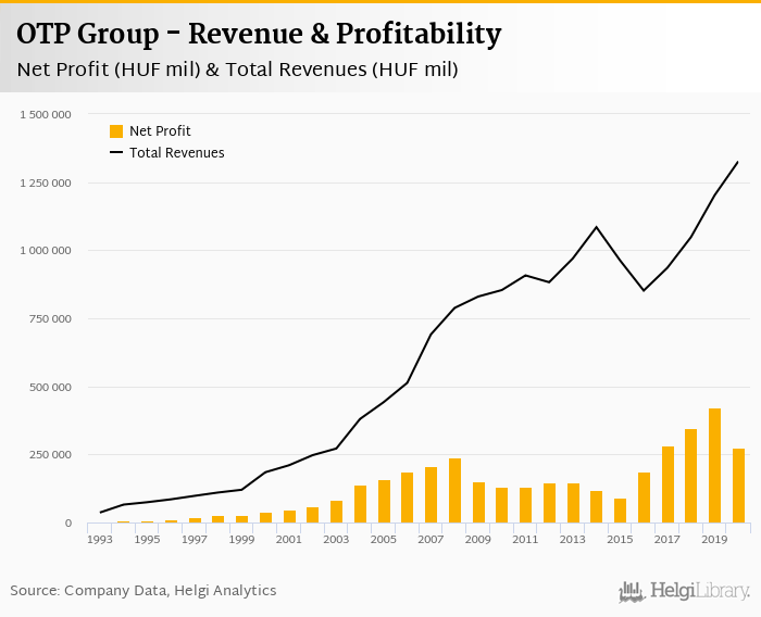 OTP Group made a net profit of HUF 276,408 mil under revenues of HUF 1,326,230 mil in 2020, up -34.8% and 10.3% respectively compared to the previous year.