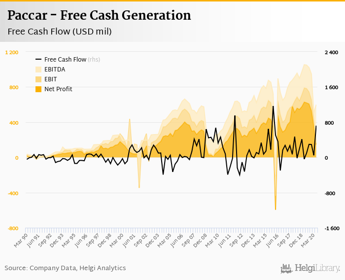 Paccar made a net profit of USD 148 mil with revenues of USD 3,062 mil in 2Q2020, down by 76.2% and down by 53.8%, respectively, compared to the previous year. This translates into a net margin of 4.82%.