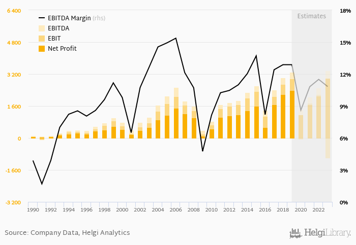 On the operating level, EBITDA reached USD 3,297 mil, up 8.96% compared to the previous year. Over the last five years, company's EBITDA has risen 7.60% a year on average.