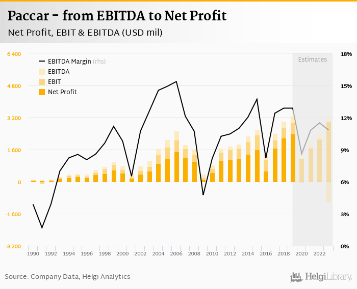 Paccar made a net profit of USD 2,388 mil with revenues of USD 25,600 mil in 2019, up by 8.78% and up by 8.95%, respectively, compared to the previous year. This translates into a net margin of 9.33%.
