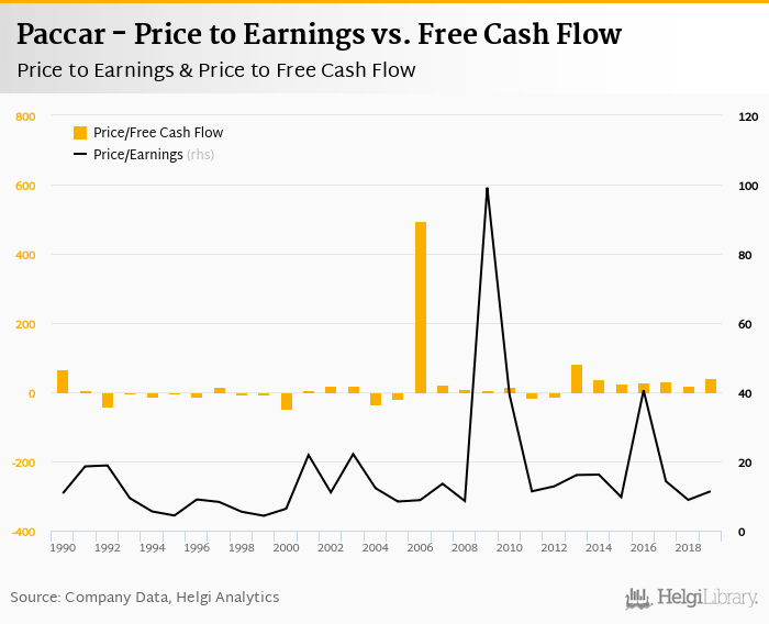 Regarding cash generated defined by the sum of net profit and depreciation, the stock traded at 10.0x at the end of 2019. When investments are excluded to get free cash flow, Paccar traded at 41.6x.