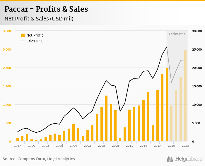 Paccar made a net profit of USD 2,388 mil in 2019, up 8.78% compared to the previous year. Total sales reached USD 25,600 mil, which is up 8.95% when compared to the previous year.