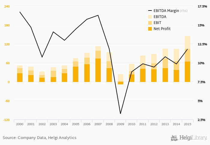 Historically, between 2000 - 2015, the firm’s net profit reached a high of EUR 74.0 mil in 2007 and a low of EUR -7.82 mil in 2009. Since 2010, the firm's net profit has increased 166% or 21.6% a year on average.