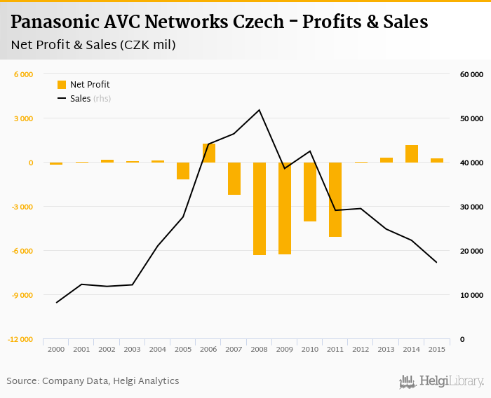 Panasonic AVC Networks Czech made a net profit of CZK 277 mil in 2015, down 77.1% compared to the previous year. Total sales reached CZK 17,165 mil, which is down 22.8% when compared to the previous year.
