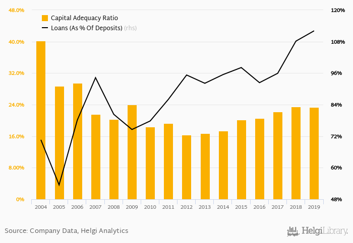 Bank's loan to deposit ratio reached 112% at the end of 2019, up from 108% when compared to the previous year. Some 10 years ago, loan to deposit ratio of the bank amounted to 74.5%.