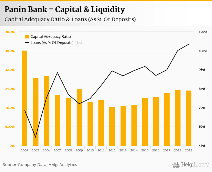 Panin Bank's capital adequacy ratio reached 23.4% at the end of 2019, down from 23.5% compared to the previous year. Historically, the bank’s capital ratio hit an all time high of 40.2% in 2004 and an all time low of 16.3% in 2012.