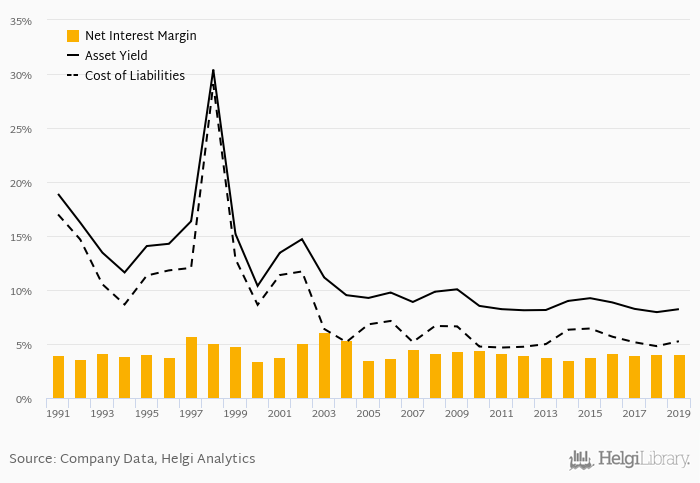 Historically, the bank’s net interest margin reached an all time high of 6.12% in 2003 and an all time low of 3.46% in 2000. The average margin in the last five years amounted to 3.99%.