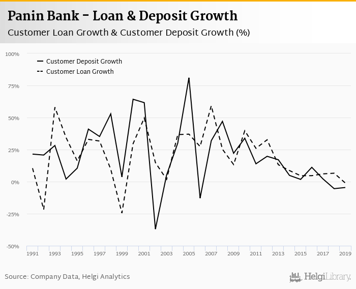 Panin Bank's customer loan growth reached -1.10% in 2019, down from 6.59% compared to the previous year. Historically, the bank’s loans growth reached an all time high of 59.2% in 2007 and an all time low of -24.5% in 1999. In the last decade, the average annual loan growth amounted to 13.4%.