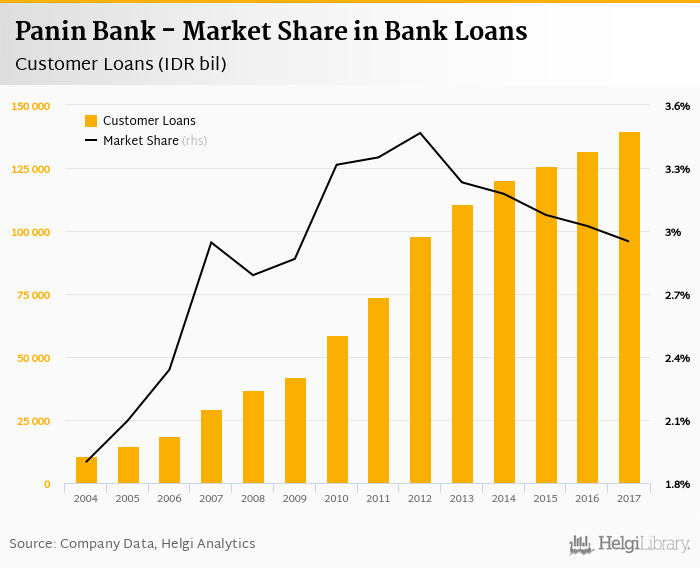 Panin Bank accounted for 2.95% of all customer loans issued in Indonesia at the end of 2017. Historically, the bank’s market share in customer loans reached an all time high of 3.47% in 2012 and an all time low of 1.90% in 2004.