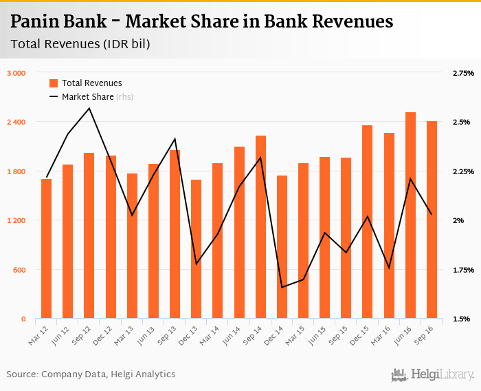 As a result, Panin Bank accounted for 2.02% of all bank revenues generated by banks in Indonesia in 2016-09-30. Historically, the bank’s market share in total revenues reached an all time high of 2.57% in 2012-09-30 and an all time low of 1.66% in 2014-12-31.
