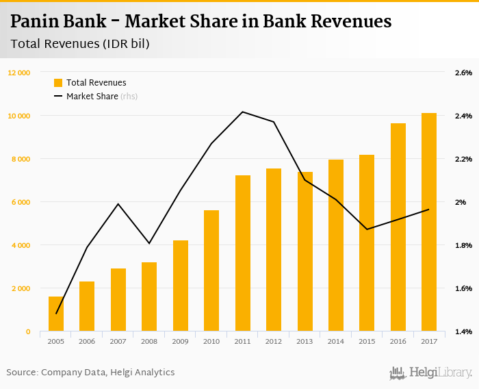 As a result, Panin Bank accounted for 1.96% of all bank revenues generated by banks in Indonesia in 2017. Historically, the bank’s market share in total revenues reached an all time high of 2.41% in 2011 and an all time low of 1.48% in 2005.
