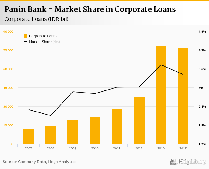 Panin Bank accounted for 3.42% of all corporate loans issued in Indonesia at the end of 2017. Historically, the bank’s market share in corporate loans reached an all time high of 3.73% in 2016 and an all time low of 2.10% in 2008.