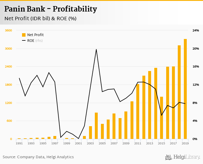 Historically, the bank’s net profit reached an all time high of IDR 3,318 bil in 2019 and an all time low of IDR 2.21 bil in 2001. The average profit in the last five years amounted to IDR 2,531 bil.