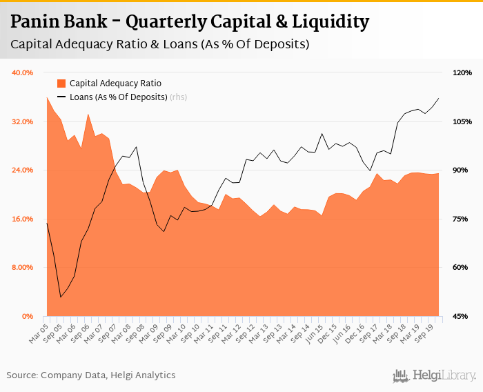 Panin Bank's capital adequacy ratio reached 23.4% at the end of fourth quarter of 2019, up from 23.3% when compared to the previous quarter. Historically, the bank’s capital ratio hit an all time high of 35.9% in 1Q2005 and an all time low of 16.3% in 4Q2012.