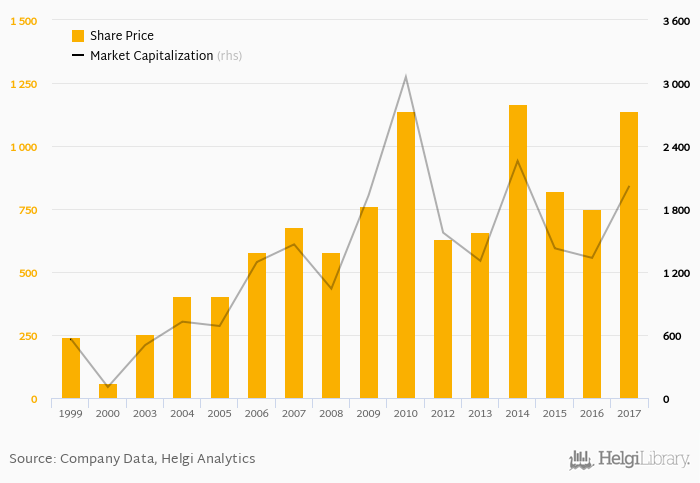 Since the end of 2012, the stock has appreciated by 81.0 % implying an annual average growth of 12.6 %. In absolute terms, the value of the company rose by USD 446 mil.