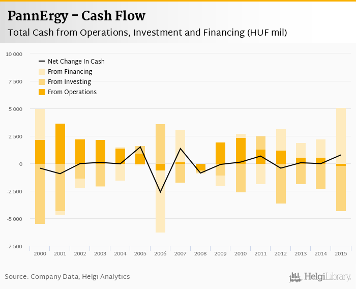 Cash from financing amounted to HUF 5,090 mil, so the company generated HUF 763 mil net cash in 2015.