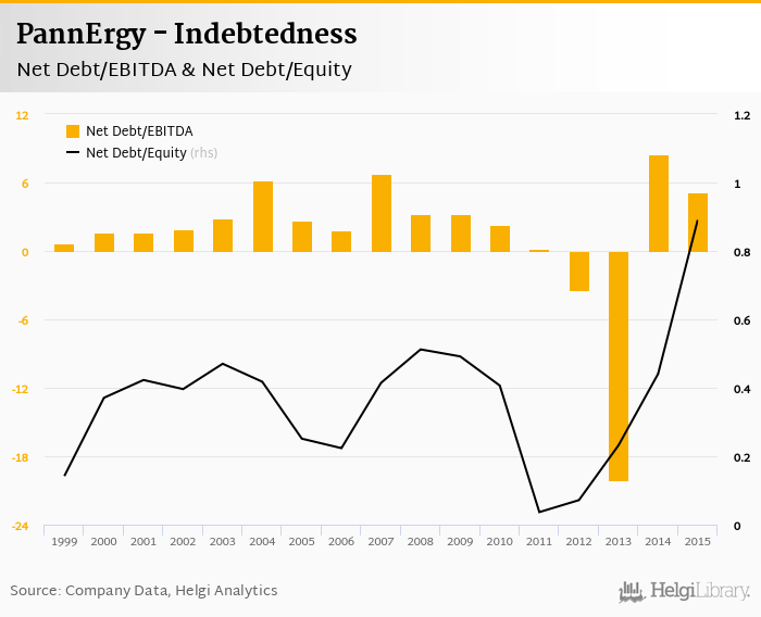 PannErgy's net debt stood at HUF 8,307 mil and accounted for 0.891 of equity at the end of 2015. The ratio is up 0.450 pp compared to the previous year.