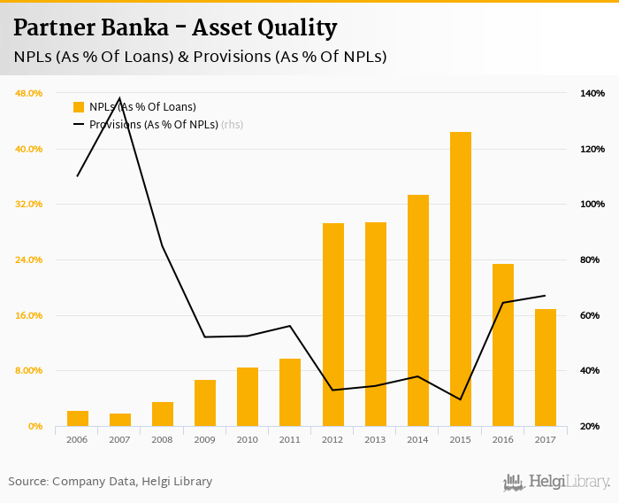 Partner Banka's non-performing loans reached 17.0% of total loans at the end of 2017, down from 23.4% compared to the previous year. Historically, the NPL ratio hit an all time high of 42.5% in 2015 and an all time low of 1.86% in 2007.