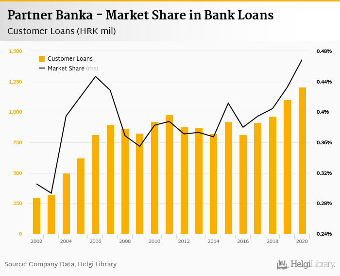 Partner Banka accounted for 0.469% of all customer loans issued in Croatia at the end of 2020. Historically, the bank’s market share in customer loans reached an all time high of 0.469% in 2020 and an all time low of 0.293% in 2003.