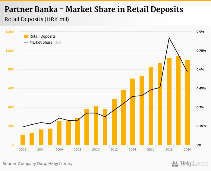 Partner Banka accounted for 0.578% of all retail deposits taken by banks in Croatia at the end of 2020. Historically, the bank’s market share in retail deposits reached an all time high of 0.851% in 2018 and an all time low of 0.142% in 2002.