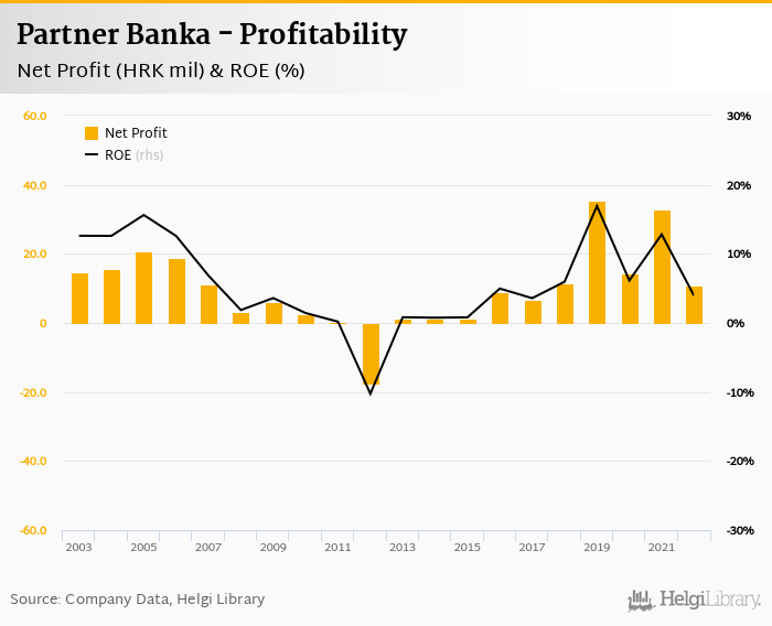 Partner Banka made a net profit of HRK 10.9 mil in 2022, down 66.8% compared to the previous year. This implies a return on equity of 3.94%.