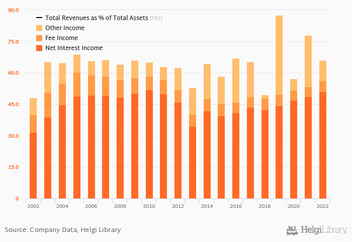 Net interest income represented of total revenues, fee income contributed and other non-interest income added further to the overall revenue generation in.
