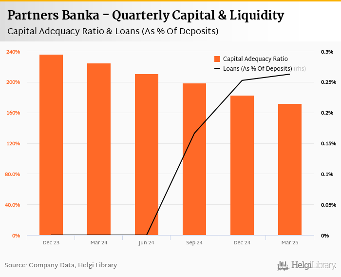 Partners Banka's capital adequacy ratio reached 172% at the end of first quarter of 2025, down from 183% when compared to the previous quarter. Historically, the bank’s capital ratio hit an all time high of 236% in 4Q2023 and an all time low of 172% in 1Q2025.