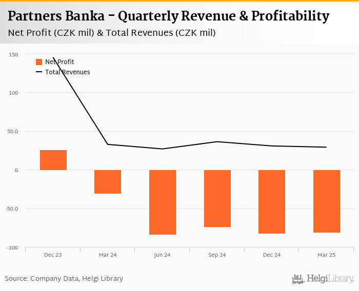 Partners Banka made a net profit of CZK -80.4 mil under revenues of CZK 29.1 mil in the first quarter of 2025, down 166% and 11.1% respectively when compared to the same period last year.