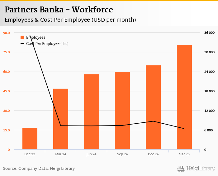 Partners Banka employed 80.6 persons in 2025-03-31, up 24.0% when compared to the previous year. Historically, the bank's workforce hit an all time high of 80.6 persons in 2025-03-31 and an all time low of 17.0 in 2023-12-31.