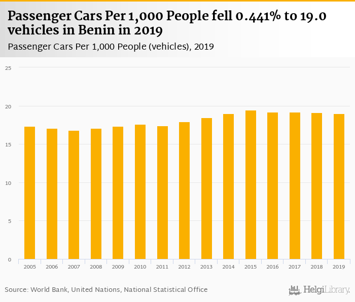 Passenger cars per 1,000 people fell 0.441% to 19.0 vehicles in Benin in 2019, according to the National Statistical Office.