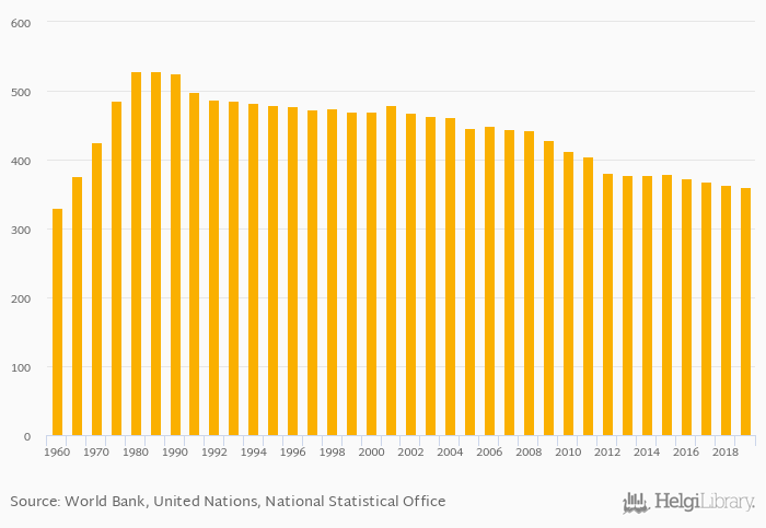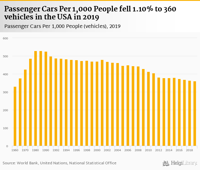 Passenger cars per 1,000 people fell 1.10% to 360 vehicles in the USA in 2019, according to the National Statistical Office.