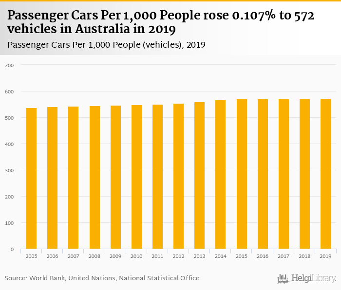 Passenger cars per 1,000 people rose 0.107% to 572 vehicles in Australia in 2019, according to the National Statistical Office.