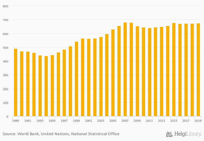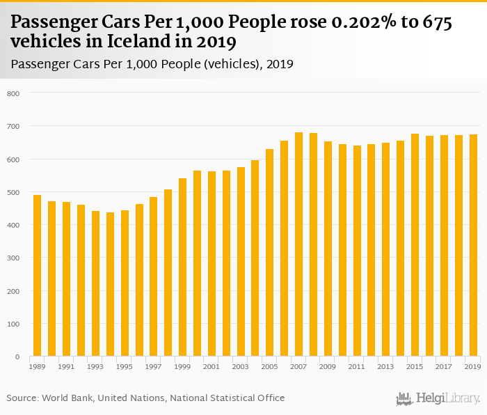 Passenger cars per 1,000 people rose 0.202% to 675 vehicles in Iceland in 2019, according to the National Statistical Office.
