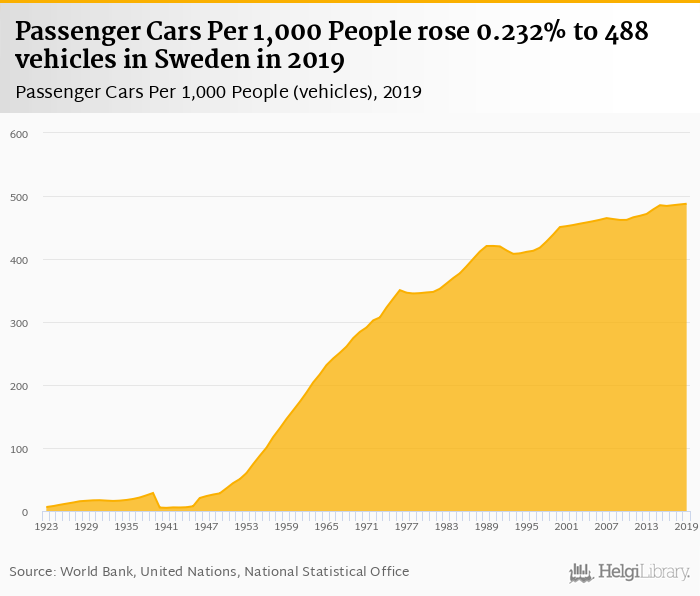 Passenger cars per 1,000 people rose 0.232% to 488 vehicles in Sweden in 2019, according to the National Statistical Office.