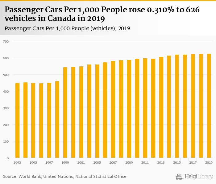Passenger cars per 1,000 people rose 0.310% to 626 vehicles in Canada in 2019, according to the National Statistical Office.