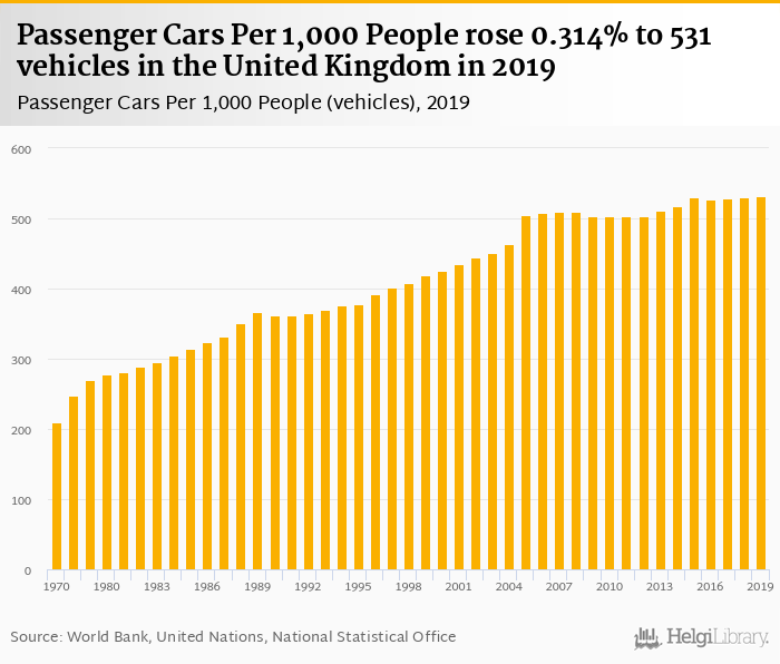 Passenger cars per 1,000 people rose 0.314% to 531 vehicles in the United Kingdom in 2019, according to the National Statistical Office.