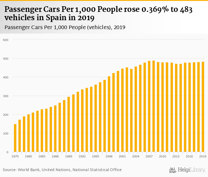 Passenger cars per 1,000 people rose 0.369% to 483 vehicles in Spain in 2019, according to the National Statistical Office.