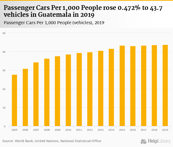 Passenger cars per 1,000 people rose 0.472% to 43.7 vehicles in Guatemala in 2019, according to the National Statistical Office.