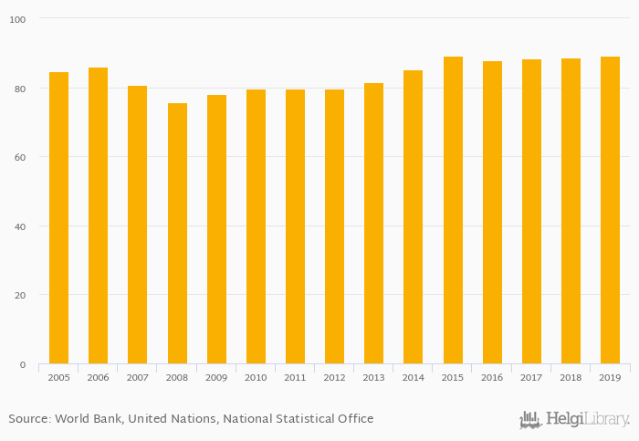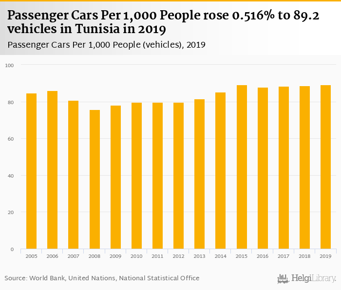 Passenger cars per 1,000 people rose 0.516% to 89.2 vehicles in Tunisia in 2019, according to the National Statistical Office.