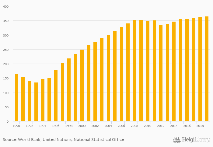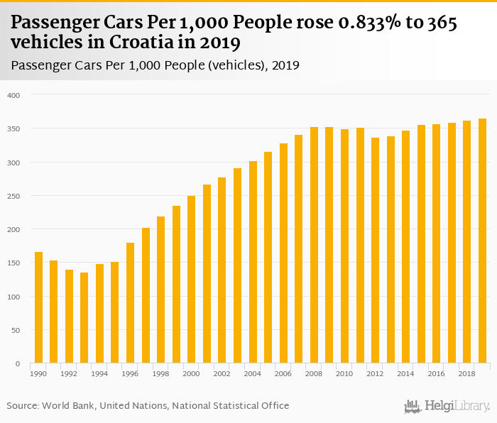 Passenger cars per 1,000 people rose 0.833% to 365 vehicles in Croatia in 2019, according to the National Statistical Office.