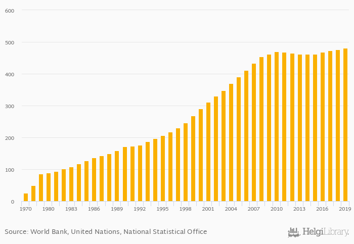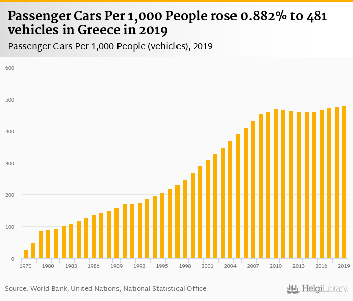 Passenger cars per 1,000 people rose 0.882% to 481 vehicles in Greece in 2019, according to the National Statistical Office.