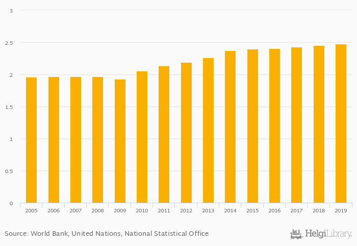 Historically, passenger cars per 1,000 people in Bangladesh reached an all time high of 2.47 vehicles in 2019 and an all time low of 1.93 vehicles in 2009.