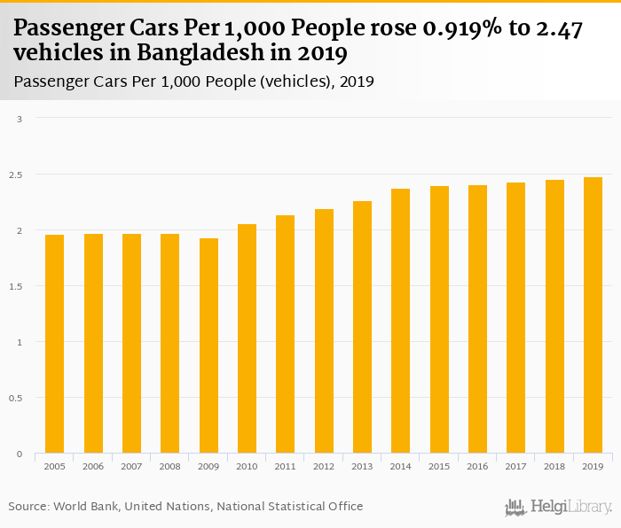 Passenger cars per 1,000 people rose 0.919% to 2.47 vehicles in Bangladesh in 2019, according to the National Statistical Office.