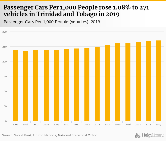 Passenger cars per 1,000 people rose 1.08% to 271 vehicles in Trinidad and Tobago in 2019, according to the National Statistical Office.