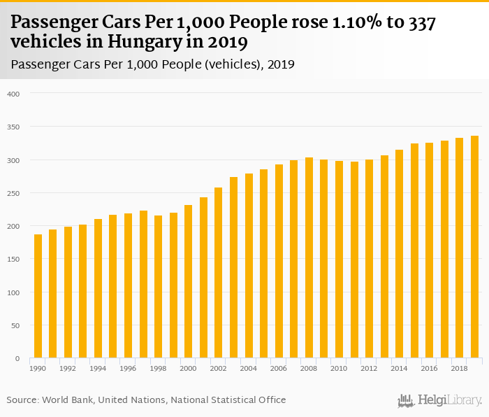 Passenger cars per 1,000 people rose 1.10% to 337 vehicles in Hungary in 2019, according to the National Statistical Office.